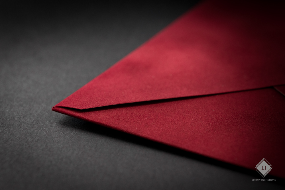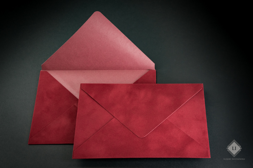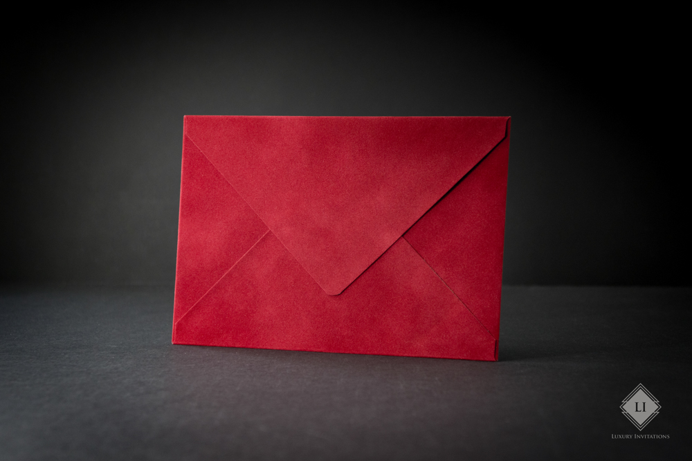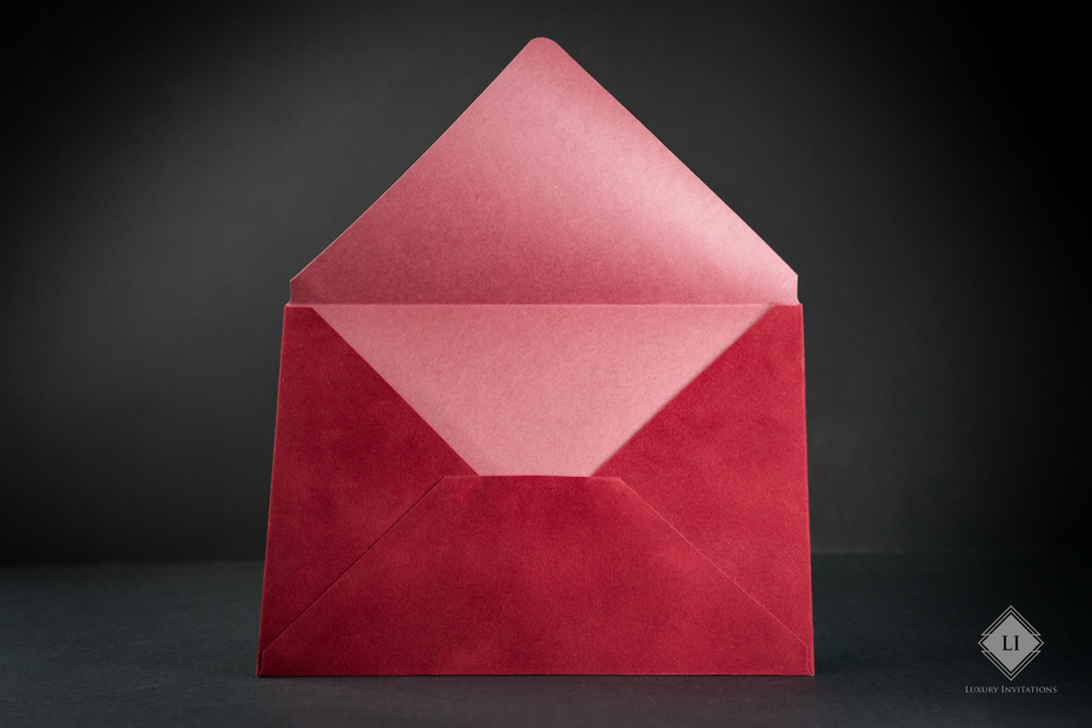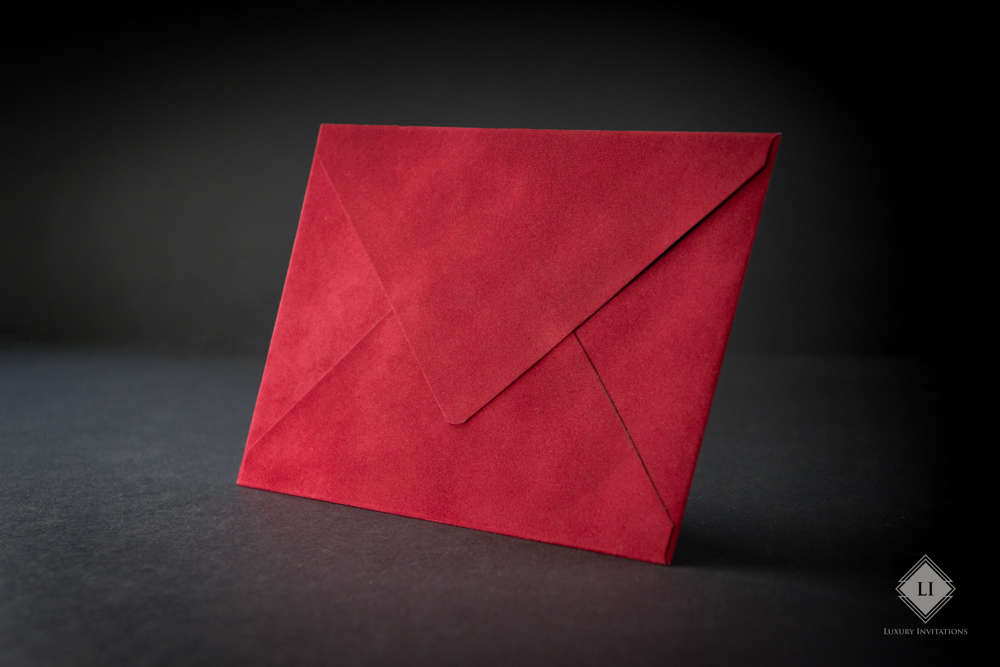Acest model de plic este rosu aprins, realizat hand made cu un aspect fin velvet. Interiorul este de culoare rosu, Clapeta plicului este in forma de V, iar deschiderea se realizeaza pe latura mare.